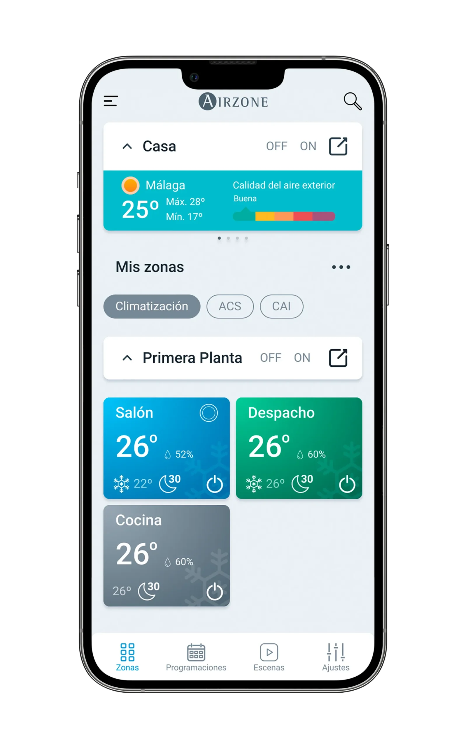La app de Airzone te permite gestionar toda la instalación desde tu móvil: puedes encender la calefacción en las zonas que vas a usar desde la cama para que la cocina esté a temperatura perfecta en el desayuno o que los niños no tengan frío al salir de la cama.